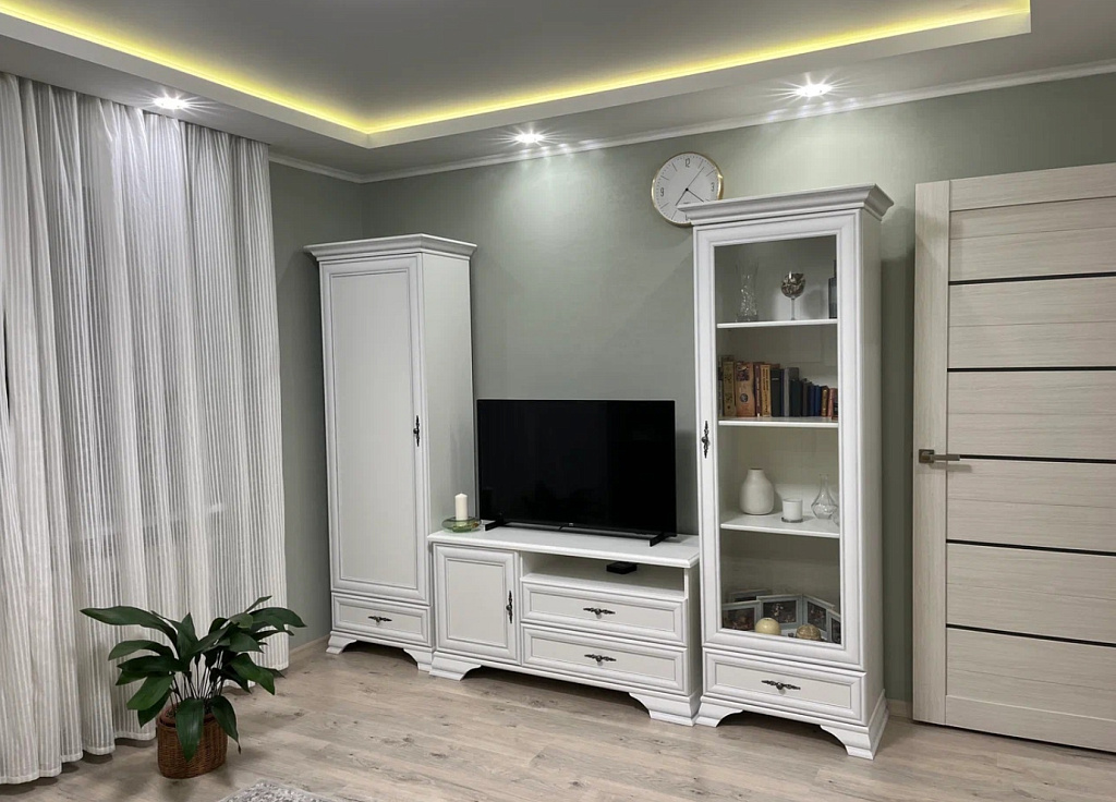 • Наличие декоративных карнизов с серебристой патиной, подчеркивающих классический стиль исполнения.