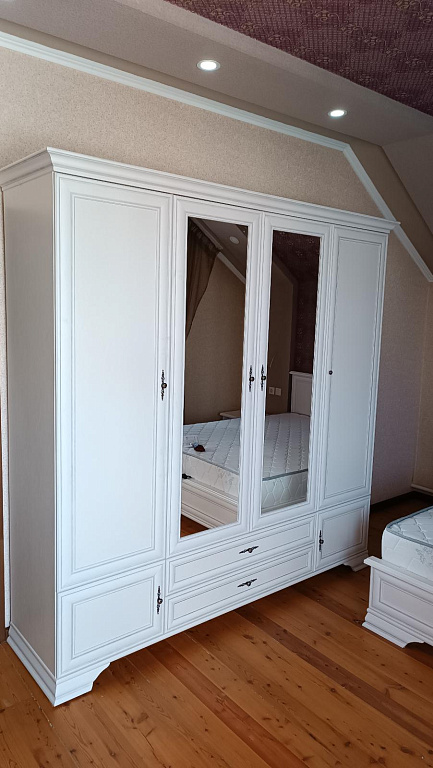 • Наличие декоративных карнизов с серебристой патиной, подчеркивающих классический стиль исполнения.